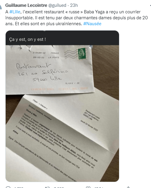 Elle ajoute : « C’est injuste. Nous aussi on aimerait que la guerre cesse rapidement. Mais la géopolitique, c’est une chose. Les peuples, c’en est une autre ; Pourquoi haïr les Russes ? ». Une autre de ses proches lui a envoyé la vitrine d’une librairie niçoise remplie d’ouvrages sur la Russie ou sur Poutine. « On a l’impression d’être des stars mais à l’envers. On n’a rien demandé. Ça fait huit ans qu’il y a cette guerre. On n’en peut plus. »