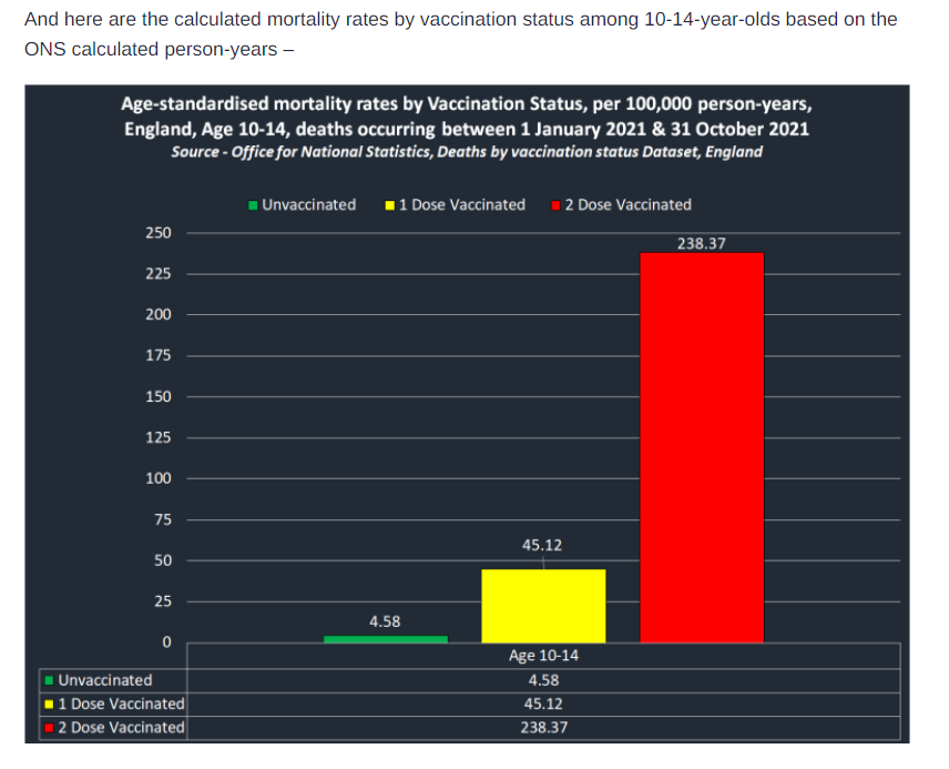 Les statistiques britanniques nous démontrent qu’en 2021 le risque de décéder (toutes causes confondues) pour les 10 à 14 ans était cinquante fois plus élevé pour les vaccinés que pour non vaccinés covid: 238 décès pour 100 000 contre 4,5