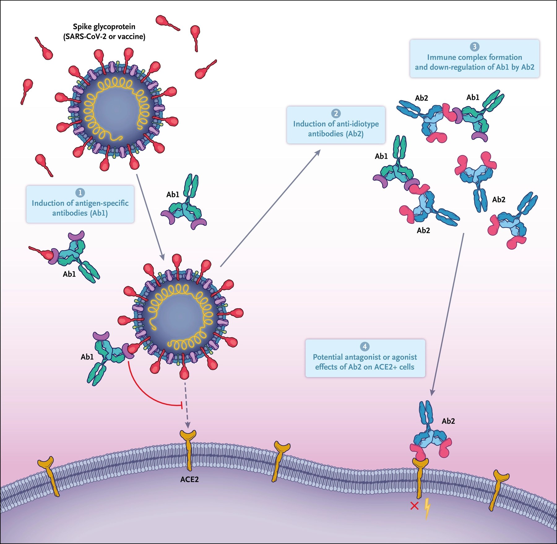 L’infection par le coronavirus 2 du syndrome respiratoire aigu sévère (SRAS-CoV-2) et les vaccins contre celle-ci suscitent des anticorps contre la protéine de pointe que le virus utilise pour se lier au récepteur de l’enzyme de conversion de l’angiotensine 2 (ACE2) sur les cellules cibles. Le récepteur est largement exprimé. Ces anticorps sont appelés Ab1. Le