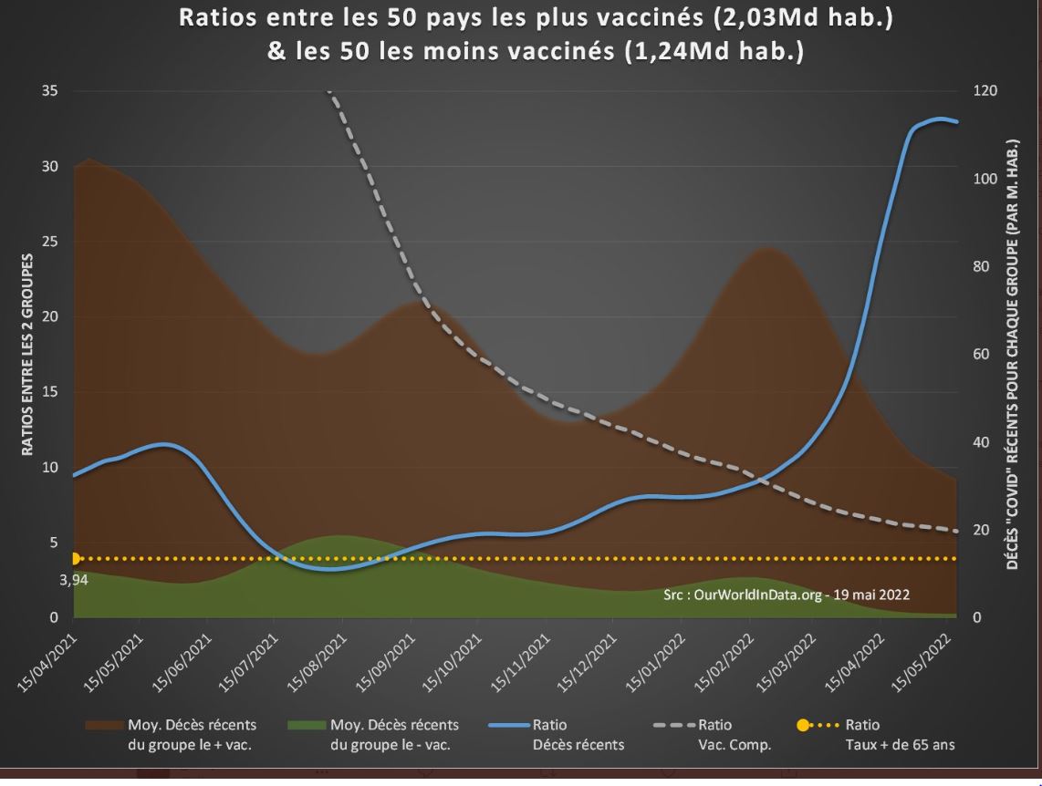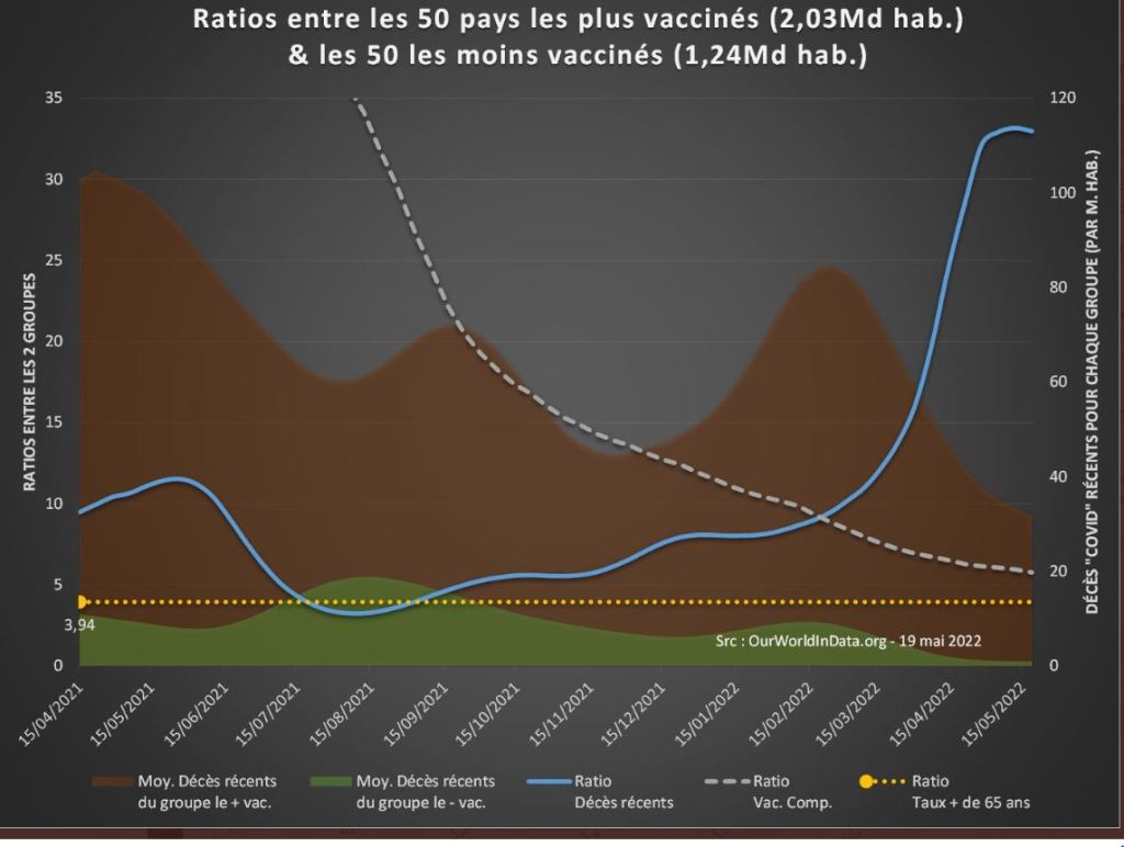 « Sans le vaccin, on aurait déploré 5 à 10 fois plus de décès… » Vraiment ? Suivez la courbe bleue qui montre l’évolution, sur 1 an, du ratio entre les décès récents pour les 50 pays les plus vaccinés et les 50 les moins vaccinés…/…