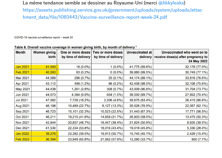 La covid déja présente au moment de la conception des bébés de 2021 ne saurait fournir l’explication . Plus étrange la chute correspond aux conceptions de la période de vaccination massive des 18 à 45 ans au cours de l’été 2021.