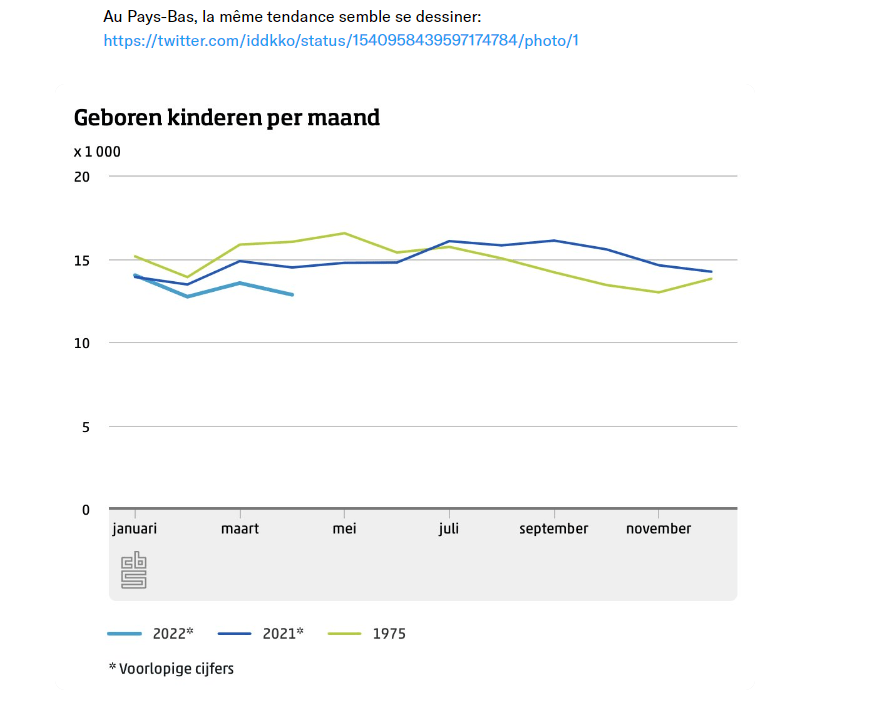 Pourquoi donc les naissances de mars avril et mai 2022 sont elles moins nombreuses qu’à la même époque l’an dernier? Le phénomène n’est pas contestable dans les pays industrialisés mais également les plus vaccinés .