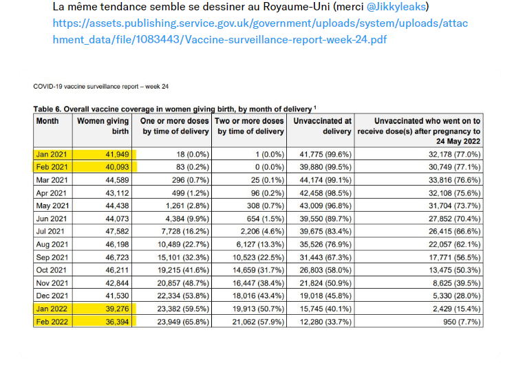 La covid déja présente au moment de la conception des bébés de 2021 ne saurait fournir l’explication . Plus étrange la chute correspond aux conceptions de la période de vaccination massive des 18 à 45 ans au cours de l’été 2021.