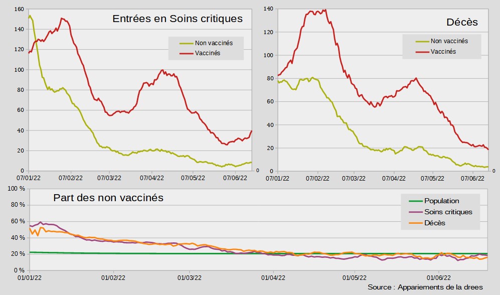 Le graphique ci-dessous présente l’indicateur aux mêmes dates. En février, il y avait 27 décès par 10 millions pour les vaccinés et 59 pour les non-vaccinés. Donc à priori, l’indice est favorable aux vaccinés et tendrait à montrer une efficacité. Cependant, l’évolution temporelle montre qu’à partir d’avril, il y a moins de décès parmi les non-vaccinés que parmi les vaccinés pour qu’en juin, on ait 5 décès par 10 millions pour les vaccinés et 4 pour les non vaccinés.
