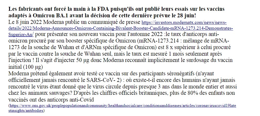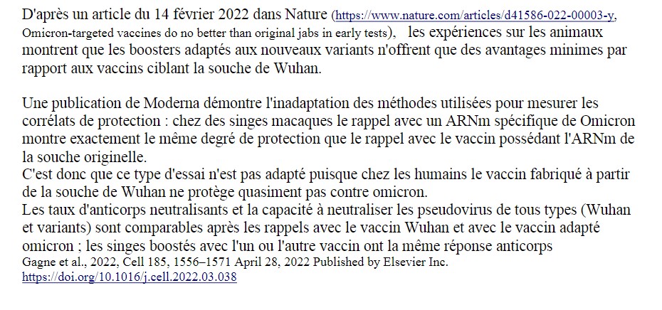 La nouvelle génération d’injection se prépare , elle sera fabriquée à partir de la protéine spike toxique de Wuhan vieille de près de trois ans et de celle d’Omicron, et des mutants connus. Helene Bannoun nous apprend que les essais sur les macaques donnent les mêmes résultats que les anciens vaccins… tion . Le virus mute trop rapidement et s’il intègre Omicron Ba1 il est totalement inefficace contre les déa connus varianst Omicron Ba 5