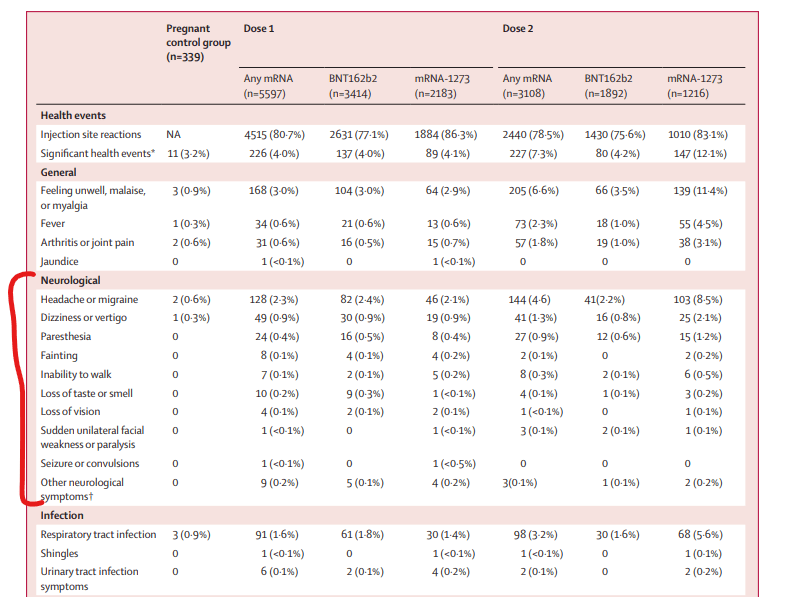En 7 jours de suivi ils ont réussi à avoir, sur 5597 vaccinées: 4 qui ont perdu la vue 7 incapables de marcher 91 infections respiratoires 1 paralysie soudaine du visage, 83 fausses couches (8 après 2e trimestre post dose1) 175 faussecouches (5.6%sur 3114) entre dose1 &2