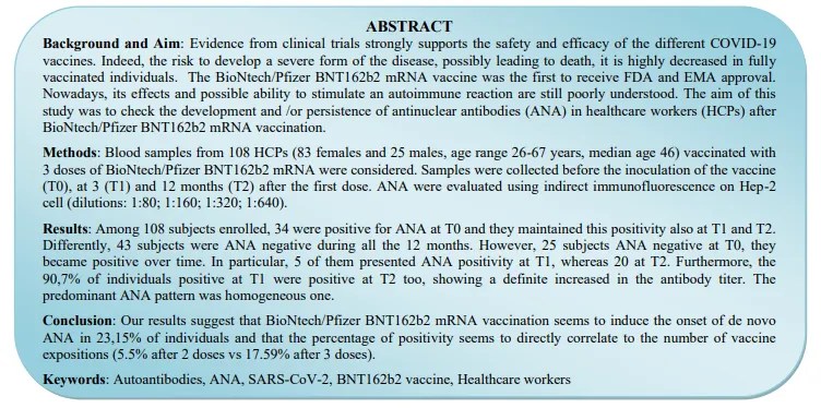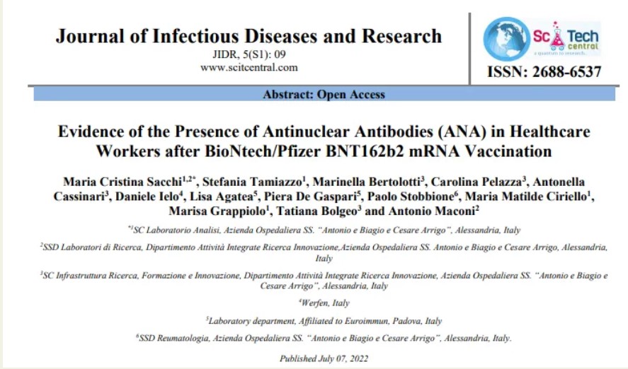 Dans cette étude italienne, ils ont examiné une cohorte de 108 travailleurs de la santé suivant leurs titres d’anticorps ANA avant la vaccination, à trois mois et à 12 mois après la vaccination.