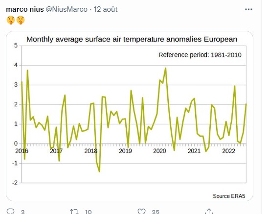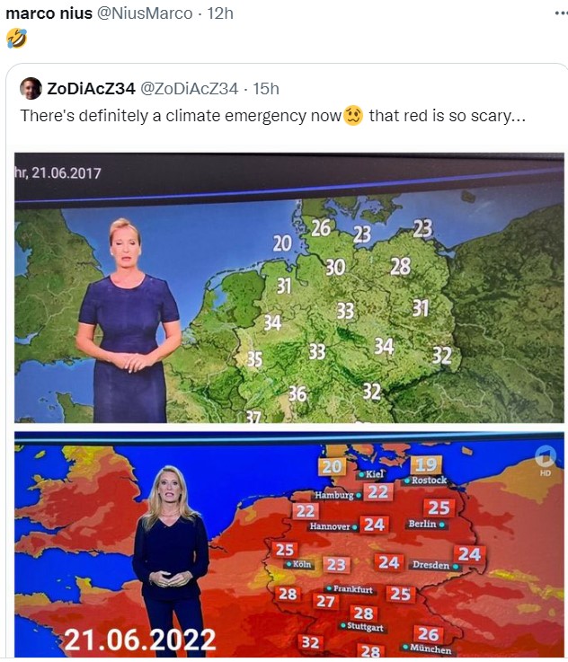 Ne soyons donc pas surpris si l’International center for journalism qui coordonne la bonne pensée ( avec le financement de Pfizer et de Gates) sur la covid ou le réchauffement climatique et assure la censure sur Facebook donne des consignes précises: réduire la question au gaz carbonique et accentuer le catastrophisme… Consignes suivies même dans les choix des couleurs des cartes météo;;;