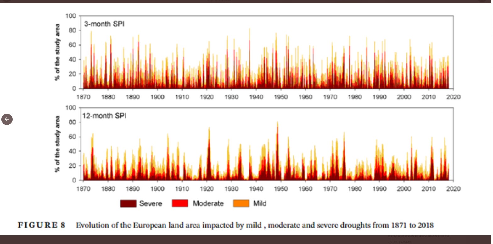 Vicente-Serrano et al. 2020 a examiné diverses mesures de la sécheresse européenne sur la période 1871-2018 et a conclu : « Les résultats révèlent une absence générale de tendances à long terme statistiquement significatives dans le domaine de l’étude