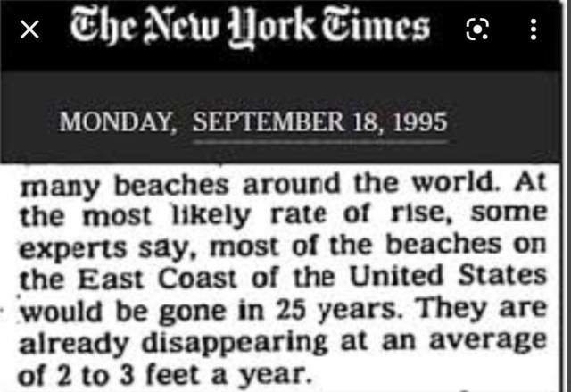Le lundi 18 septembre 1995, le New York Times a écrit un article avertissant que les plages de la côte Est auraient disparu dans 25 ans.