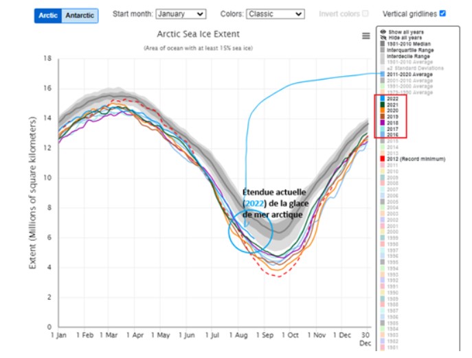Voyons donc, de nouveau, ce qu’indiquent les dernières données glaciologiques arctiques en cette fin de mois d’août 2022. En date du 21 août 2022, l’étendue de la glace de mer arctique était de 6,82 millions de kilomètres carrés, supérieure à celle des années 2016, 2017, 2018, 2019, 2020, 2021 le même jour, d’après le graphique comparatif suivant du NIC Comparatif annuel de l’étendue de la glace de mer arctique5 :