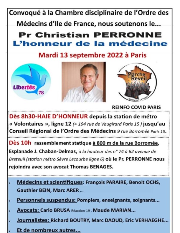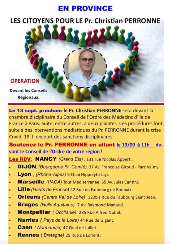 Pour les personnes qui ne peuvent venir sur Paris à 9h métro Volontaires, rassemblement devant tous les conseils départementaux de l’ordre des médecins à 11h Outre le fait de soutenir le Pr Christian Perronne vous soutiendrez les médecins convoqués par les conseils départementaux