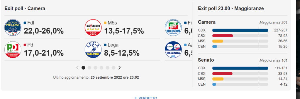 selon les sondages de sortie d’urnes la coalition menée par Meloni obtiendrait la majorité absolue dans les deux chambres