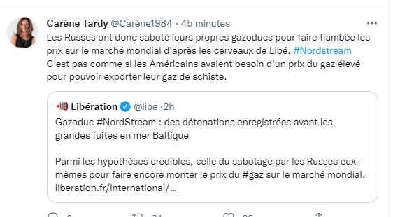 La presse racontera que les Russes qui se tirent dessus dans la centrale nucléaire occupée depuis mars par leurs troupes et sabotent leur gazoduc mais bon écoutez Joe Robinette