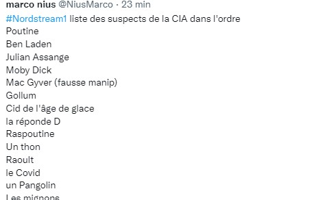 Donc: au lieu de simplement couper le robinet, la Russie aurait fait exploser son propre gazoduc dans des eaux hostiles avec des exercices sous-marins de l’OTAN juste à côté. Il faut un QI d’huître pour y croire. La story des médias occidentaux est un test de stupidité.