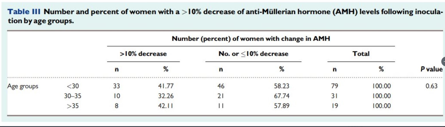 Il est fascinant de constater qu’à peu près la même astuce a été utilisée pour la fertilité féminine, dans une étude israélienne mesurant l’impact de la vaccination covid sur L’hormone de régression müllérienne (HRM), indicateur de la réserve ovarienne.