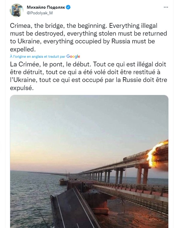 L’#Ukraine avec l’aide de l’#OTAN a attaqué un symbole, le pont de #Crimée, il est fort probable qu’elle soit également l’auteur du bombardement ayant privé d’alimentation électrique la centrale nucléaire de #Zaporijia qui a 10 jours d’autonomie diesel. Ils sont fous.