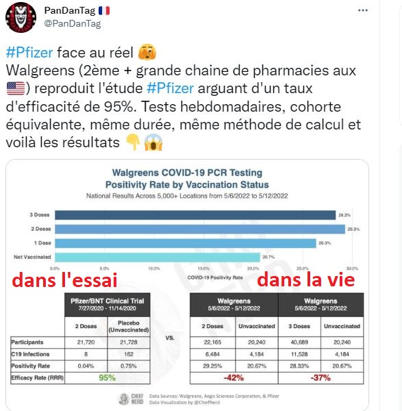 La seconde chaine de pharmacies américaine fournit des données de surveillances précieuses sur la vaccination et la covid . A partir de ces données appliquées aux cohortes de l’essai Pfizer l’ efficacité des injections devient négative….