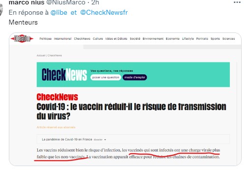 Quant au gouvernement, il n’a jamais jugé utile de corriger ses mensonges qui assuraient : « Tous vaccinés, tous protégés » ; « Vaccinez-vous pour protéger les autres » ; « Se faire vacciner, c’est se protéger et protéger les autres », etc. Faut-il rappeler que c’est au nom de cette fake news qu’un passe sanitaire, puis vaccinal, a été imposé, instituant une discrimination sanitaire odieuse et absurde? C’est au nom de cette même fable faussement civique et altruiste que le personnel médical non vacciné a été jugé indésirable et écarté des emplois.