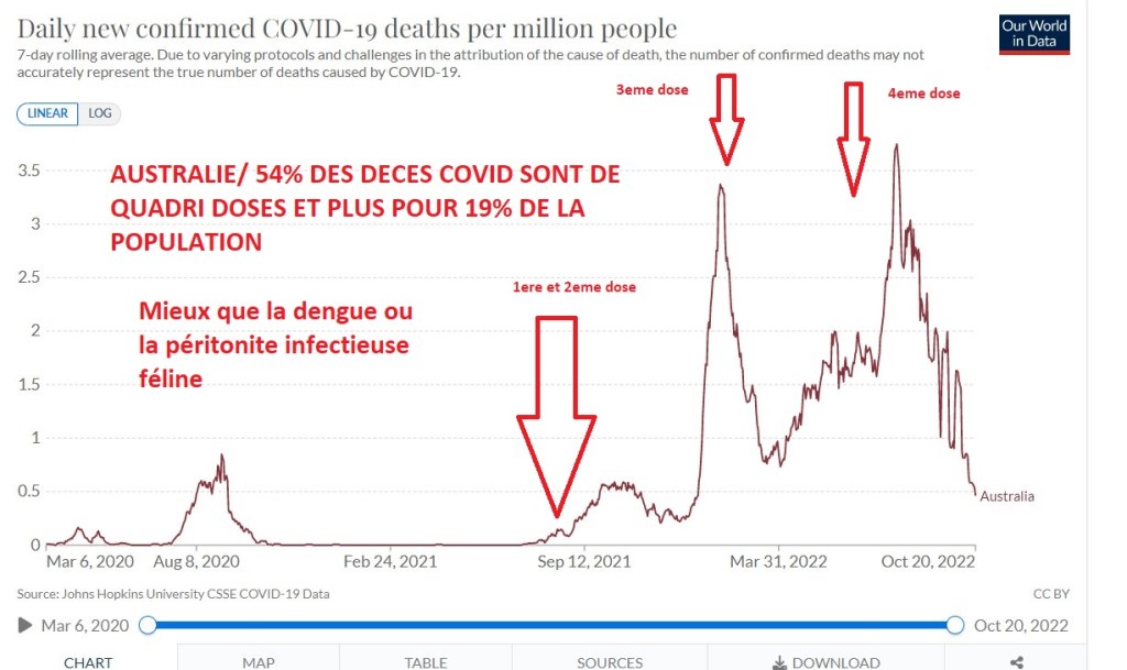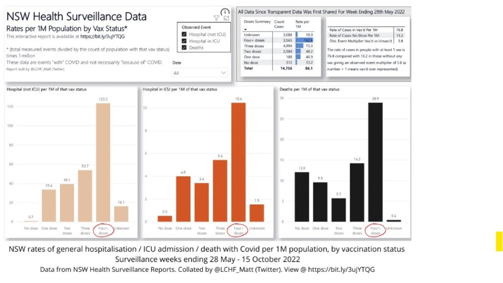 Nous ne parlons pas des cancers et des crises cardiaques qui explosent mais d’un covid aggravé par les injections , phénomène bien connu pour les coronavirus des animaux vaccinés. Là il s’agit des données accessibles de Nouvelle Galles du Sud en Australie (région de Sidney, 8M d’ha )