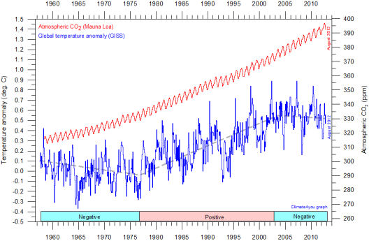 Regardez bien le document ci dessous il met en évidence le caractère cyclique du climat, aucune anomalie de températures( en rouge), aucune preuve de rechauffement mais une explosion de la quantité de CO2