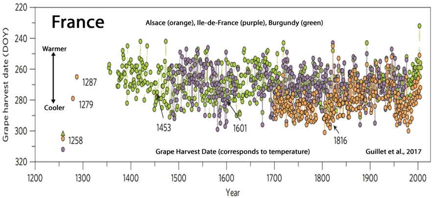 A long terme elles inventent un optimum médiéval pas très chaud: il y avait pourtant de la vigne à Terre Neuve…. TOUTES LES TEMPERATURES D AVANT 1975 SONT REFROIDIES, MINOREES