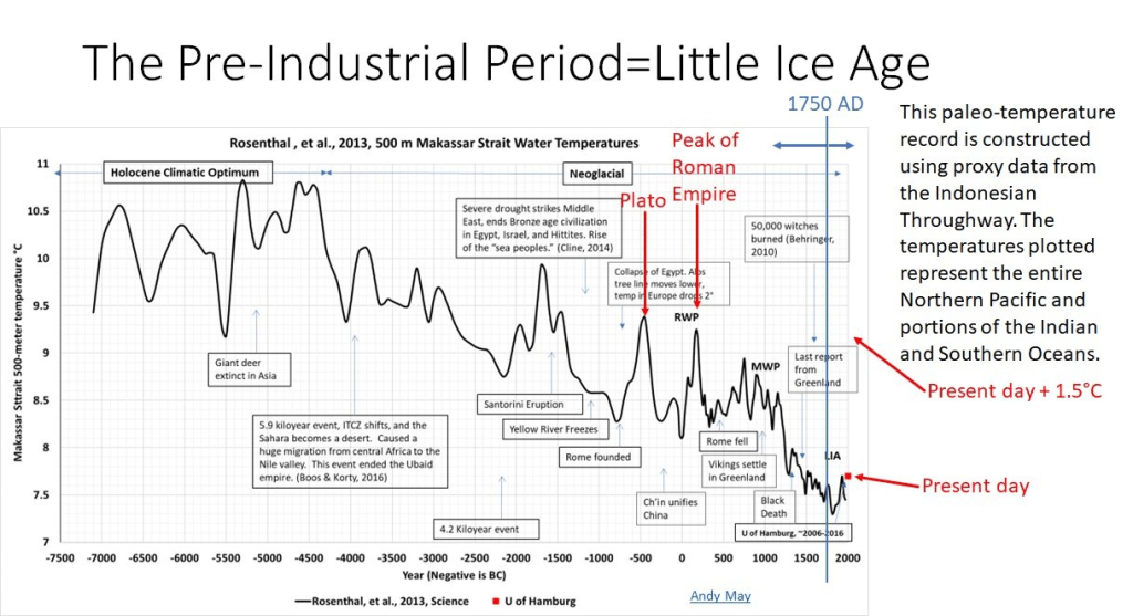 Si nous ajoutons 1,5 degré à la température d’aujourd’hui, nous atteignons 9,2°C, soit à peu près la même température dans le Throughflow indonésien, que celle observée pendant la période chaude romaine, appelée RWP, ou la température à laquelle Platon a vécu et enseigné.Elle est bien plus d’1°C plus froide que pendant l’Optimum climatique de l’Holocène, lorsque la civilisation et l’agriculture humaines ont été inventées.