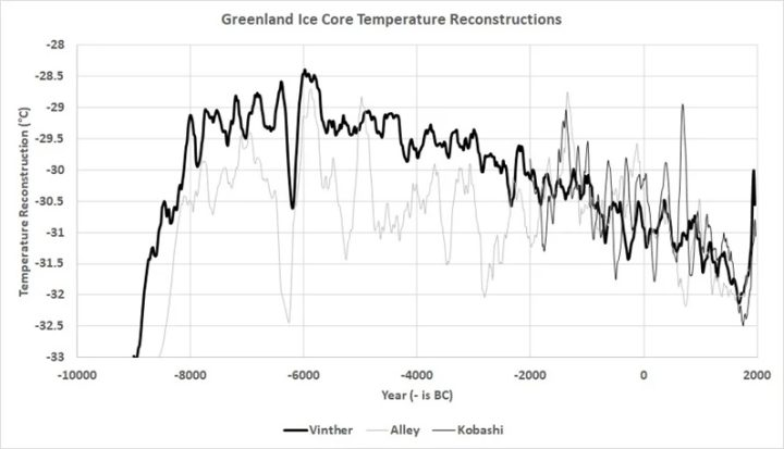 Cette reconstitution montre une baisse de température d’environ 3°C entre 4500 av. J.-C. et le début du petit âge glaciaire en 1750 ap. J.-C. La reconstitution de la T° de la carotte de glace du Groenland de Bo Vinther montre également une baisse de trois degrés :