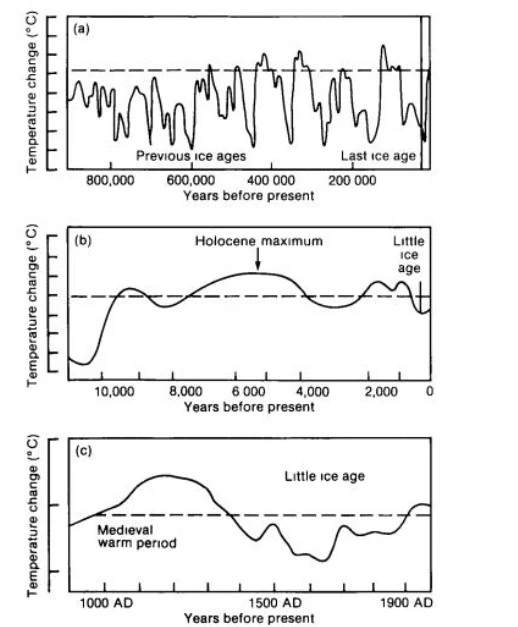 Historiens, préhistoriens, archéologues , mais également tous ceux qui ont étudié les fossiles et les polléns savent que la terre a connu plusieurs changements majeurs du climat avec des âges glaciaires successifs . Le dernier s’est terminé il y a plus de 12 000 et nous sommes entrés et sommes toujours dans un âge interglaciare, l’Holocène .