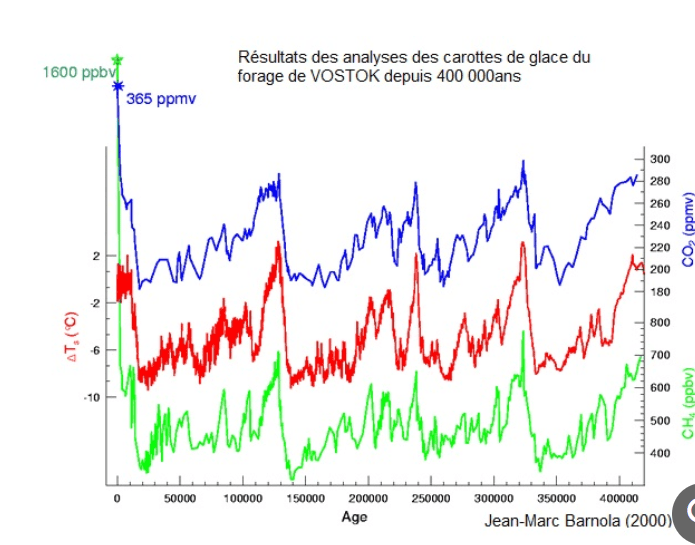 La composition des gaz et les poussières piégés dans ces échantillons de glace et leurs concentrations, nous informent sur les causes de leurs variations dans l’atmosphère. Cela peut-être des isotopes d’oxygène, (ci-dessous sur le thermomètre isotopique), des dioxyde de carbone CO2 et méthane CH4)Le forage de Vostok en Antarctique, débuté en 1998, (à plus de 2600 mètres de profondeur) donne accès à des glaces vieilles de 420 milliers d’années. Les analyses de Vostok ont permis d’établir une corrélation directe entre les concentrations de gaz à effet de serre et la variation des températures à la surface du globe Mais cause ou consequence?????