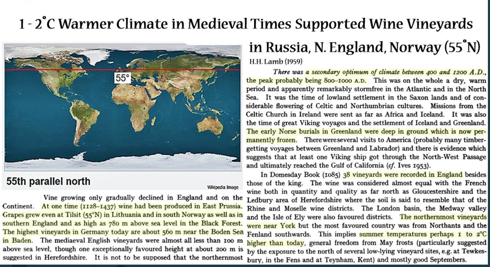 médiéval, autour de l’an mil et qui a vu la colonisation de Groenland (étymologiquement « terre verte ») par des Danois qui y ont implanté de nombreuses colonies où on cultivait le blé… la vigne poussait dans le nord de l’Angleterre… notons que durant ces optima les glaciers alpins avaient disparus facilitant le passage des Alpes (certains cols encore aujourd’hui impraticables l’hiver étaient libres toute l’année !).