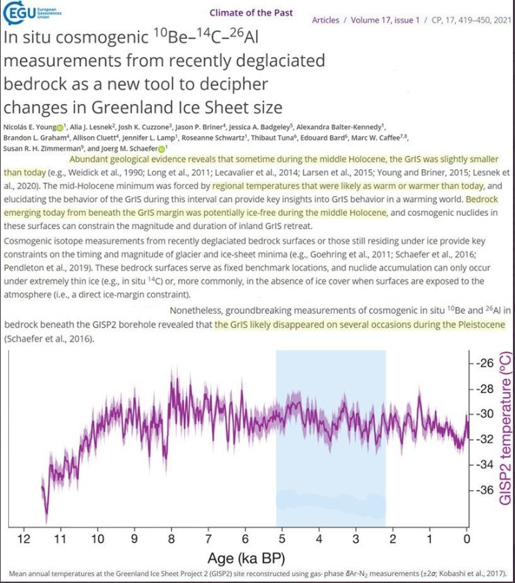 UNE NOUVELLE ETUDE (10/2022) nous apprend que le Groenland s’est réchauffé de 10 degrès en soixante ans (4 ° de plus qu’actuellement ) il y a plus de 10 000 ans avec deux ou trois fois moins de co2 qu’actuellement