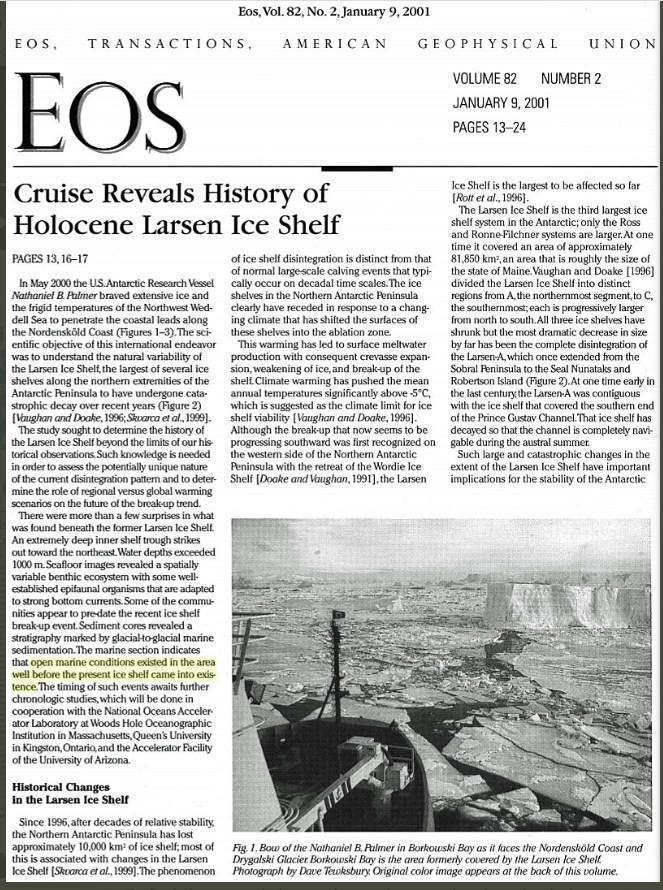 Jusqu’à il y a 1000 à 2000 ans, l’Antarctique était jusqu’à 5°C plus chaud qu’aujourd’hui. Des conditions d’eau libre ont prévalu pendant la majeure partie de l’Holocène (les 11 700 dernières années) dans la zone où se trouve aujourd’hui l’imposante plate-forme glaciaire Larsen.
