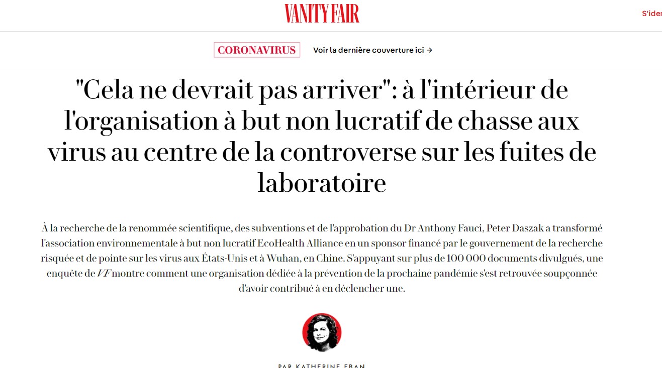 Que se passe-t-il ? Vanity Fair nous parle de Fauci, Daszak, Baric, EcoHealth Alliance, FOIA, de problèmes de sécurité dans les labos de Wuhan, séquences cachées, pressions, financements. Un média main stream devenu complotiste ? Assurément un grand pas.