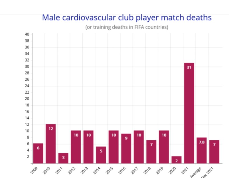2 Responses to Pfizerite ou anxiété à l’approche de la coupe du monde: multiplication par quatre des décès cardiovasculaires de joueurs pro de football ( autant en décembre2021 qu’en une année normale )