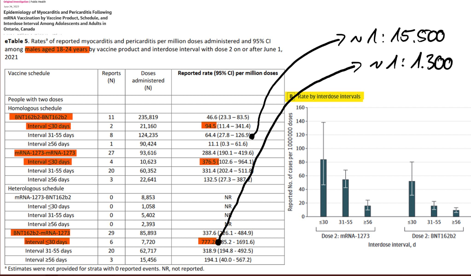 Le risque est d’autant plus élevé que l’intervalle entre les vaccinations est court et pour Spikevax MODERNA (ARNm à dose plus élevée !) plus grand que pour Comirnaty PFIZER. Le graphique ci-dessus montre le risque pour les jeunes hommes après 2 vaccinations. Par Booster (= non. 3) et peut-être même 4e coup, le risque augmente encore.