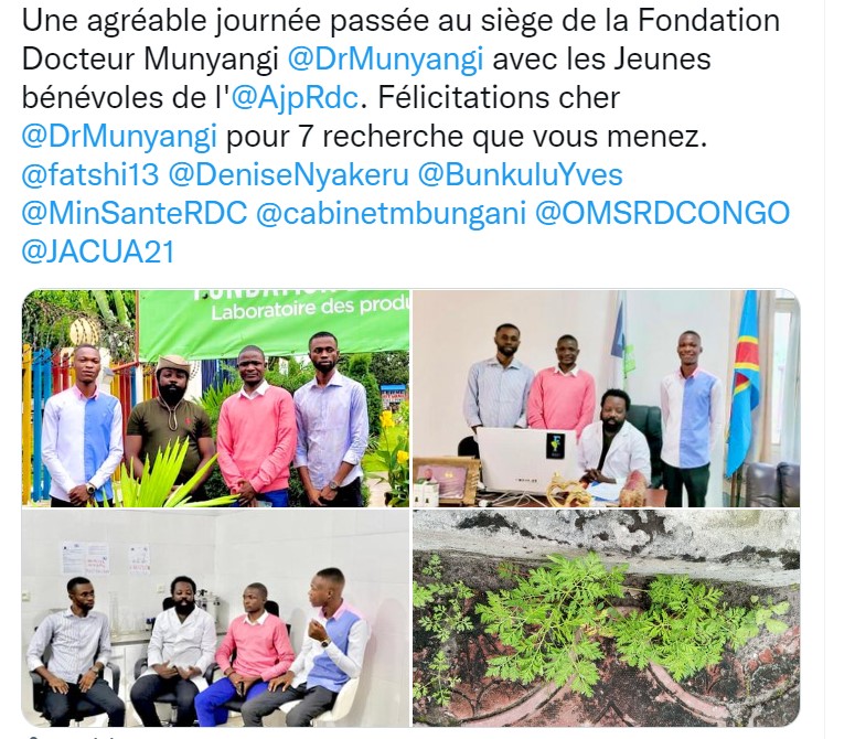 laboratoire des produits naturels de la Fondation Dr Munyangi de l’Armée des jeunes contre le Paludisme, une initiative de l’Alliance des Dirigeants Africains contre le Paludisme « ALMA ». Félicitations à ces jeunes qui ont compris le sens de notre combat