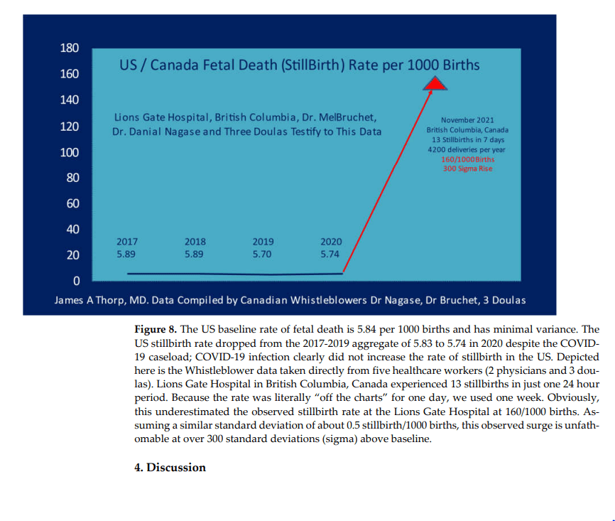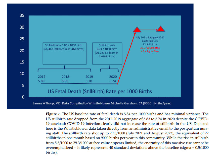 Les vaccins COVID-19, lorsqu’ils sont comparés aux vaccins contre la grippe, sont associés à une augmentation significative des EI avec tous les rapports proportionnels de déclaration > 2,0 : anomalies menstruelles, fausse couche, anomalies chromosomiques fœtales, malformation fœtale, hygroma kystique fœtal, troubles cardiaques fœtaux, arythmies fœtales, arrêt cardiaque fœtal, malperfusion vasculaire fœtale, anomalies de croissance fœtale, surveillance anormale du fœtus, thrombose placentaire fœtale, liquide amniotique faible, prééclampsie, accouchement prématuré, rupture prématurée de la membrane, mort fœtale/mortinaissance et mort prématurée du bébé (tous p les valeurs étaient bien inférieures à 0,05).