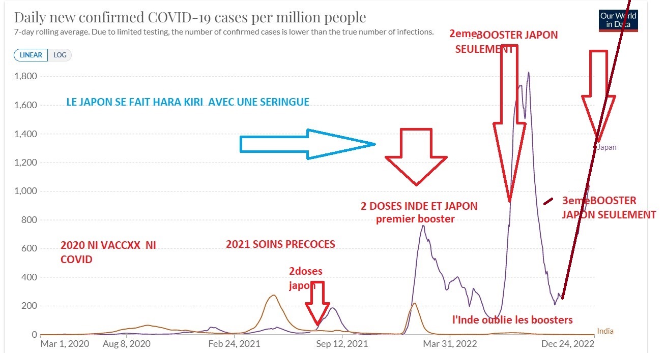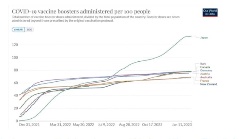 Les Japonais de plus de 65 ans ont fait de leur mieux pour réduire le stock de 612 millions de doses de vaccins ARNm du Japon, avec des taux de 3e, 4e et 5e vaccins de 91 %, 82,5 % et 56 %, respectivement. Mais malheureusement, le Japon a commencé l’année 2023 en rapportant le nombre le plus élevé de décès quotidiens dus au Covid. Pendant l’ère des rappels qui a débuté début 2022, chaque vague a été sensiblement plus élevée que la précédente.