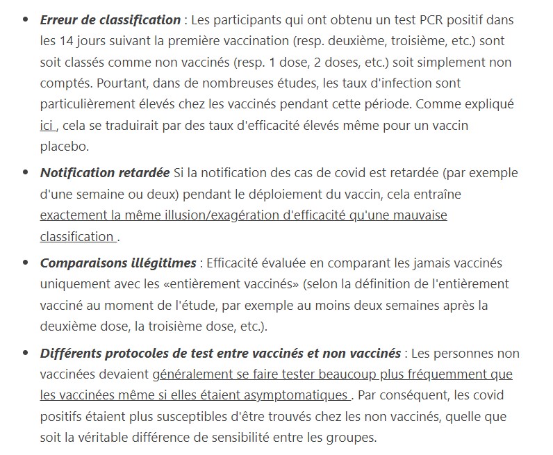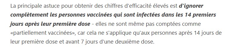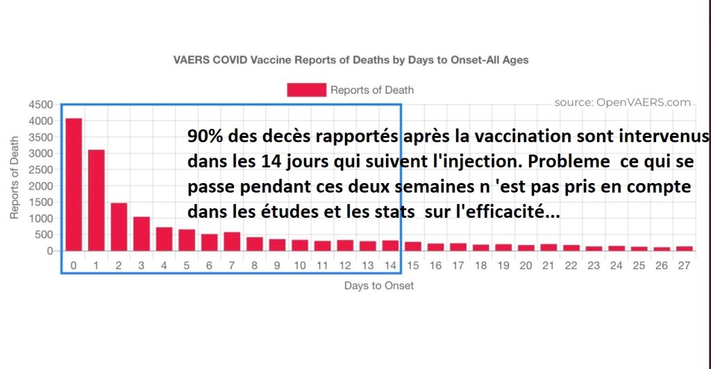 90% des decès rapportés après la vaccination sont intervenus dans les 14 jours qui suivent l’injection. Probleme ce qui se passe pendant ces deux semaines n ‘est pas pris en compte dans les études et les stats sur l’efficacité…