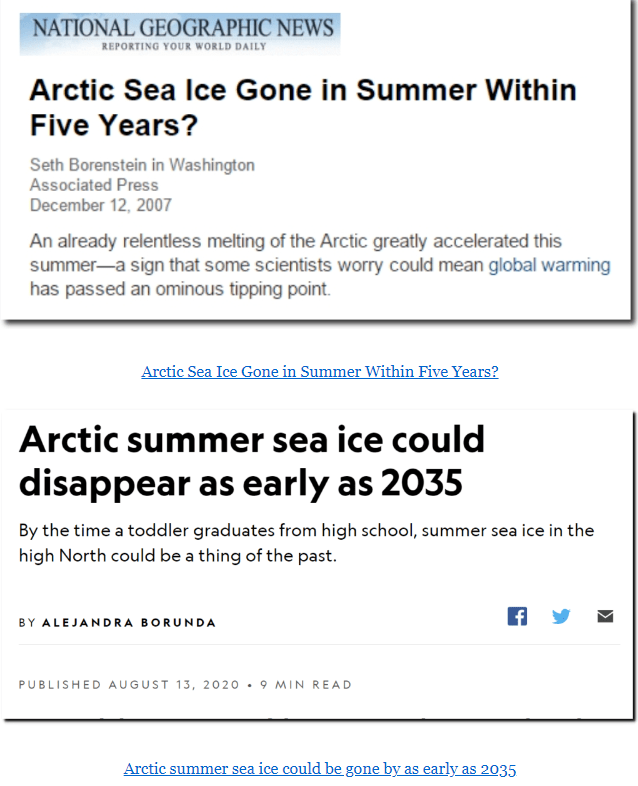 Il y a seize ans, les clowns à@NatGeo avaient prédit que l’Arctique serait libre de glace d’ici 2012. Il n’y a pas eu de déclin de la glace depuis lors, ils ont donc repoussé leur #ClimateScam jusqu’en 2035.