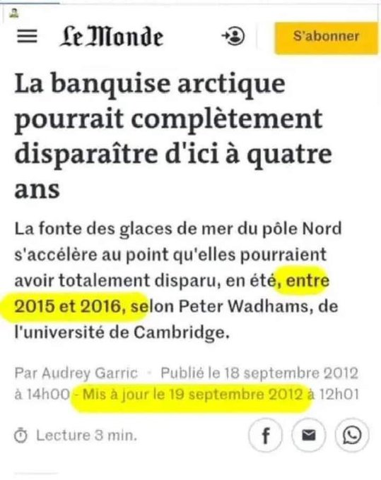 Il y a seize ans, les clowns à@NatGeo avaient prédit que l’Arctique serait libre de glace d’ici 2012. Il n’y a pas eu de déclin de la glace depuis lors, ils ont donc repoussé leur #ClimateScam jusqu’en 2035.