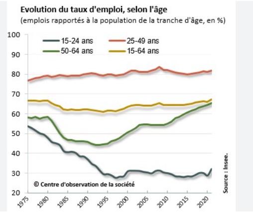Pour les 16/29 ans, il atteint 46 % en France contre 60 % en Allemagne. L’écart est de 14 points en 2022, contre 6 points en 2003. Le taux de chômage des jeunes est de 16 % en France, contre moins de 5 % en Allemagne. Le taux de jeunes qui ne sont ni en études ni en emploi est 15 % en France contre 10 % en Allemagne.