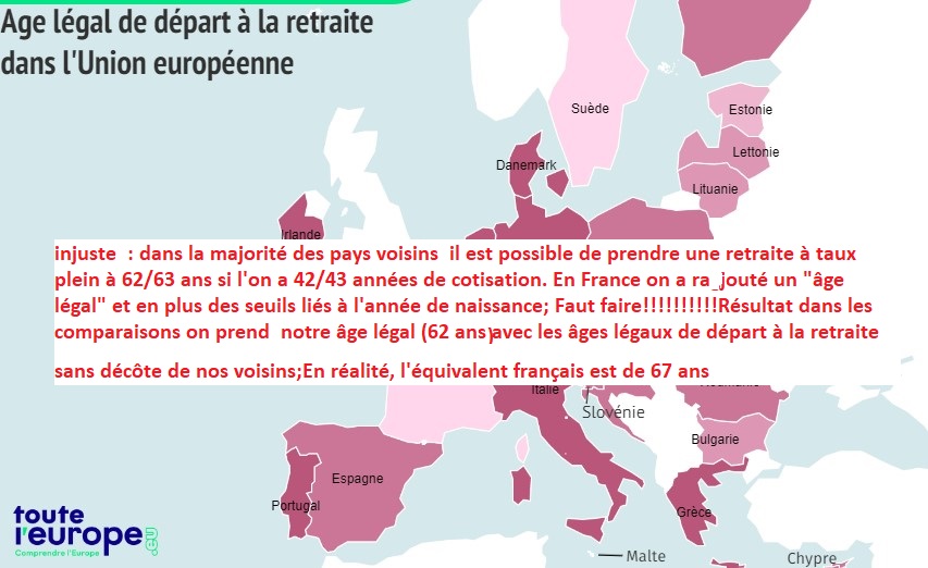 injuste : dans la majorité des pays voisins il est possible de prendre une retraite à taux plein à 62/63 ans si l’on a 42/43 années de cotisation. En France on a ragjouté un « âge légal » et en plus des seuils liés à l’année de naissance; Faut faire!!!!!!!!!!Résultat dans les comparaisons on prend notre âge légal (62 ans avec les âges légaux de départ à la retraite sans décôte de nos voisins;En réalité, l’équivalent français est de 67 ans