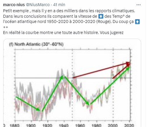 L’ interprétation du Giec , en rouge : comparer la hausse sur 80 ans et celle sur les 20 dernières années… effectivement le réchauffement s’accélère … mais c ‘est idiot, pourquoi n’ont ils pas comparé à 1920/1940… fin du cycle précédent