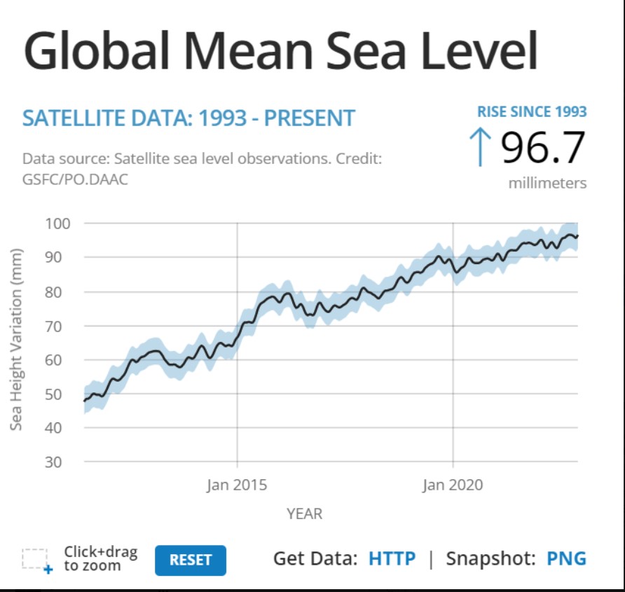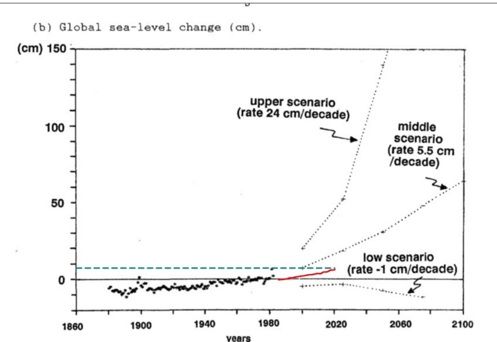 Le Giec s’est une fois de plus concentré sur une très courte période pour gonfler le phénomène . En 1990 il prévoyait 24 cm par decennie. ou 2, 4 cm par an … Trente ans après on constate qu’ils se sont plantés, dix fois moins , 2,