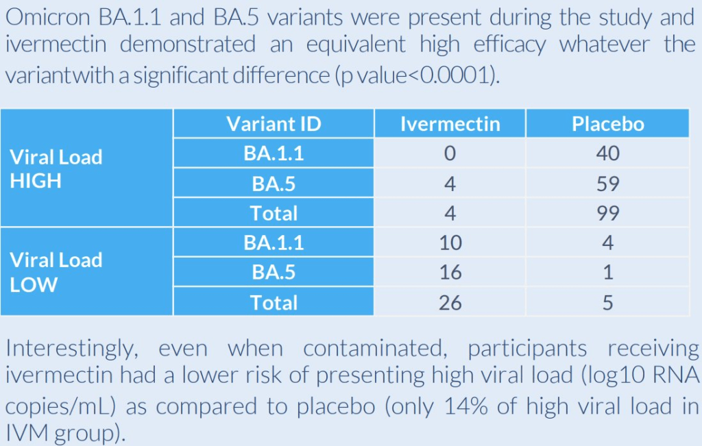 L’efficacité de l’ivermectine a été observée quel que soit le variant (BA 1.1 ou BA5). Tous les critères ont donc donné des résultats significatifs en faveur de l’ivermectine.