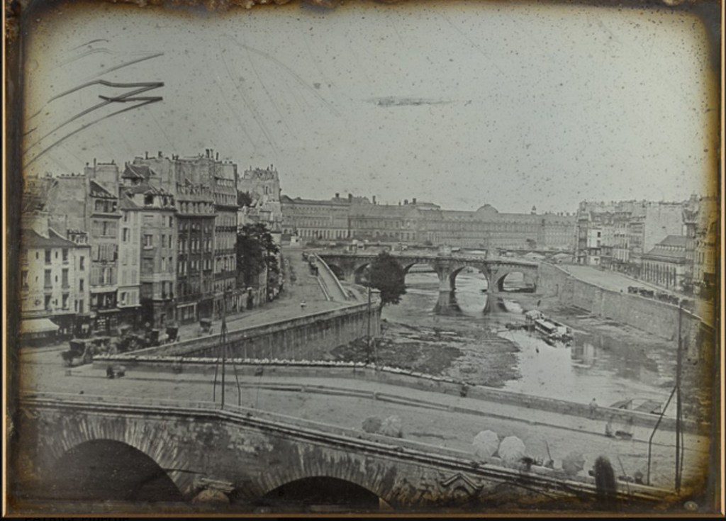 Avez-vous remarqué ? La photo de la Seine à Paris en 1842 – un daguerréotype – est inversée ! Elle est prise depuis le pont Saint-Michel en direction du Pont Neuf et au fond le Louvre mais comme il est sur la rive droite donc il devrait être à droite.