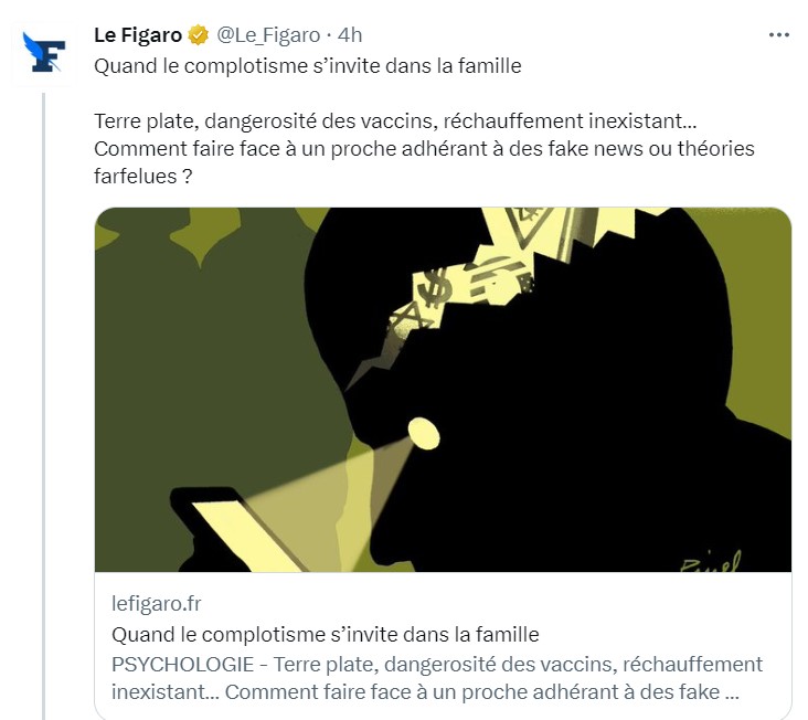 Cet articulet du Figaro relève de de qui est désigné en angais par « gaslighting » – pas facile de trouver un mot strictement équivalent en français, qui consiste à dénigrer la santé mentale de l’interlocuteur en désaccord, mais que l’on se sent incapable de convaincre – cela se rapproche de certaines decisions de l’équivalent de l’ordre des médecins en Amérique du Nord d’obliger les médecins contestataires du narratif officiel à aller suivre un cursus de rééducation, voire psychiatrique. Comme dans l’URSS, la Chine, le Cambodge des pires époques !