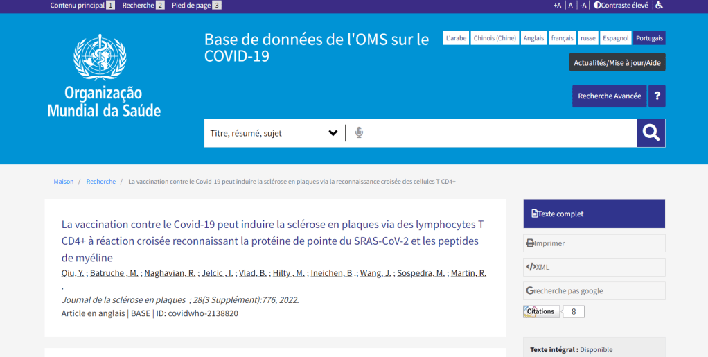 « La vaccination contre le Covid-19 peut induire la sclérose en plaques via des lymphocytes T CD4+ à réaction croisée reconnaissant la protéine spike du SARS-CoV-2 et les peptides de myéline » https://pesquisa.bvsalud.org/global-literature-on-novel-coronavirus-2019-ncov/resource/pt/covidwho-2138820